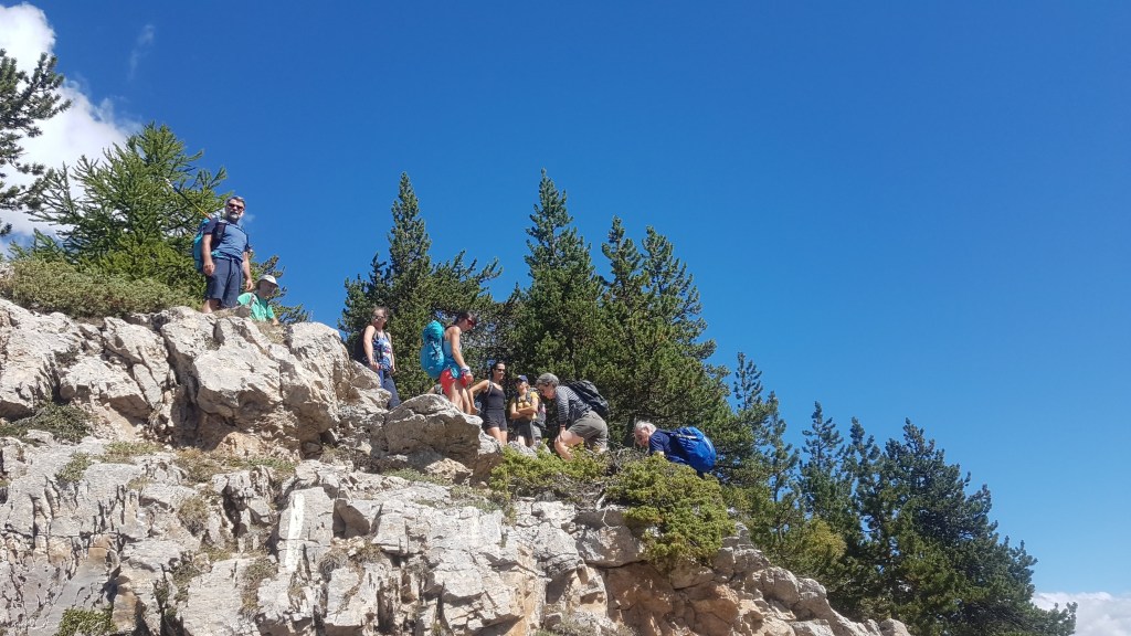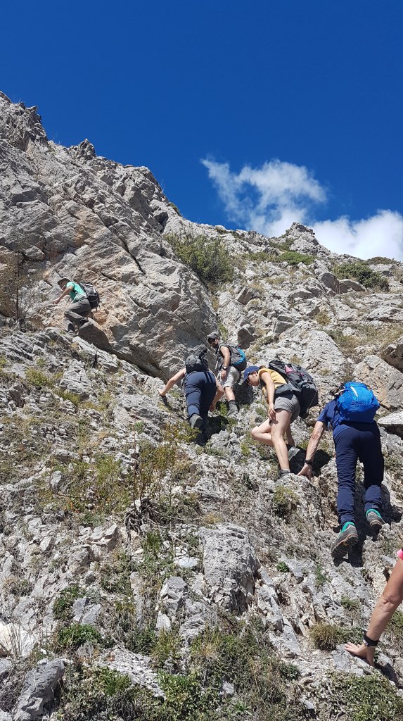Une fois les bases établies, la randonnée peut commencer ! Il fait grand beau et nous évoluons tranquillement sur un chemin qui annonce la couleur et réveille les gambettes ! Le niveau est plutôt homogène et malgré quelques passages plus techniques l’ensemble du groupe, solidaire, progresse efficacement. Je soutiens moralement et physiquement celles qui ont le plus de difficultés ; liées à une appréhension du vide. Elles me diront que c’est l’émulation du groupe et ma présence qui leurs auront permis de se challenger et d’être fières d’elles.