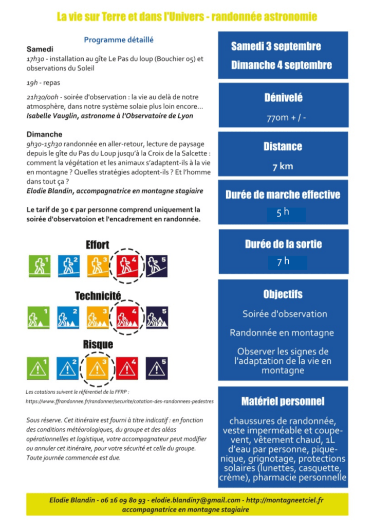 Nous avons donc réfléchi ensemble à une thématique plus précise qui permette d’allier astronomie et randonnée. Nous avons choisie d’aborder la question de la VIE au sens large, à la fois dans notre système solaire et au delà, et sur Terre avec la notion d’adaptation de la vie en montagne.