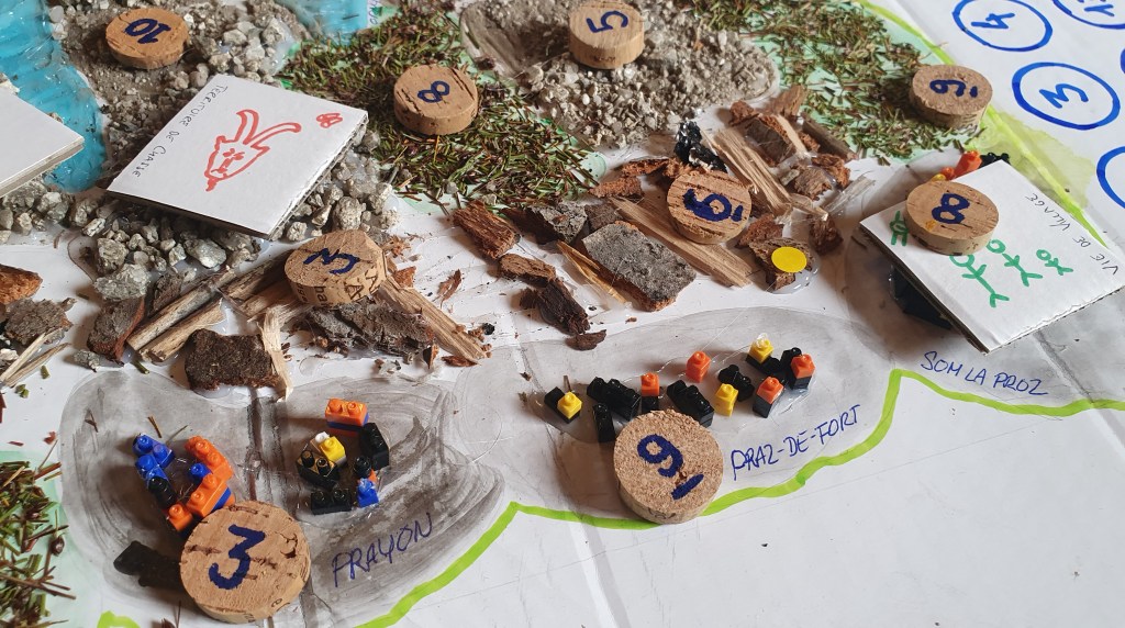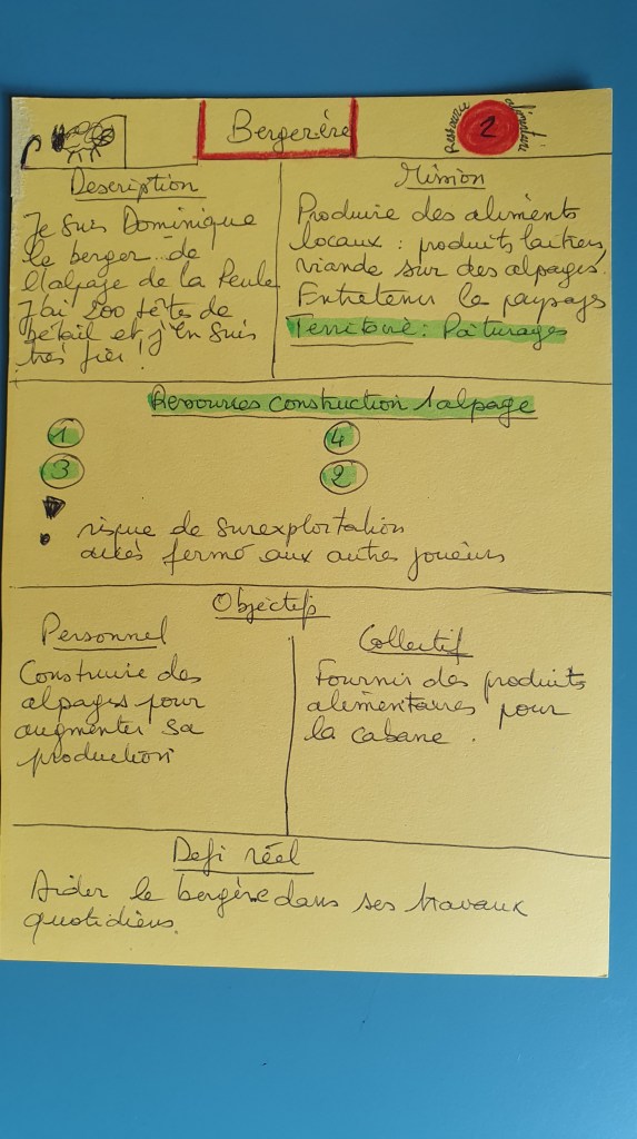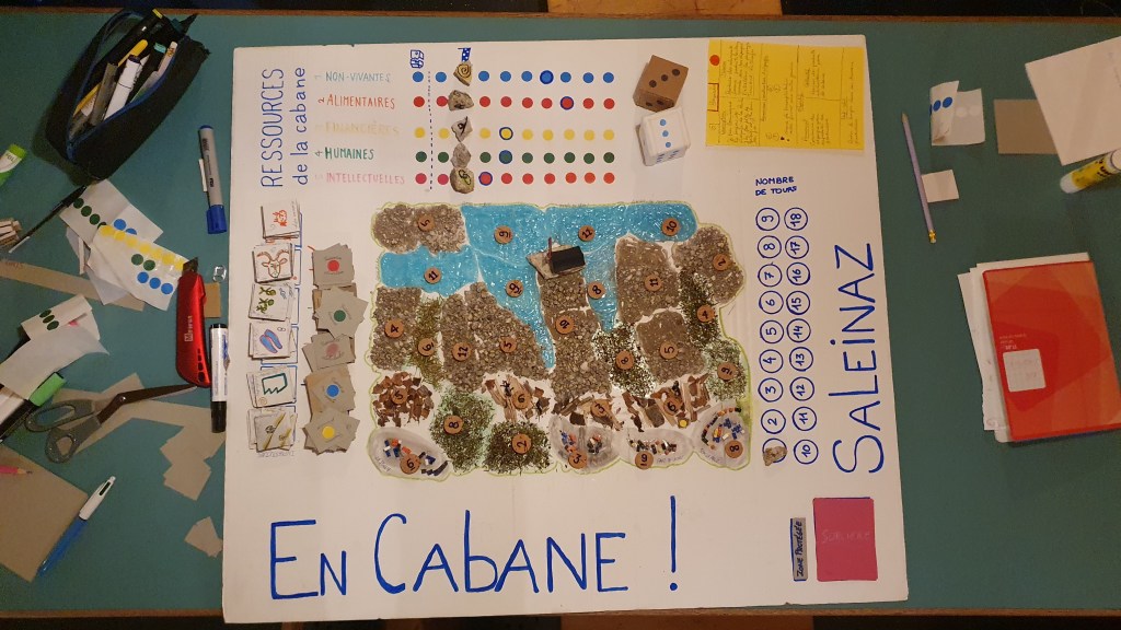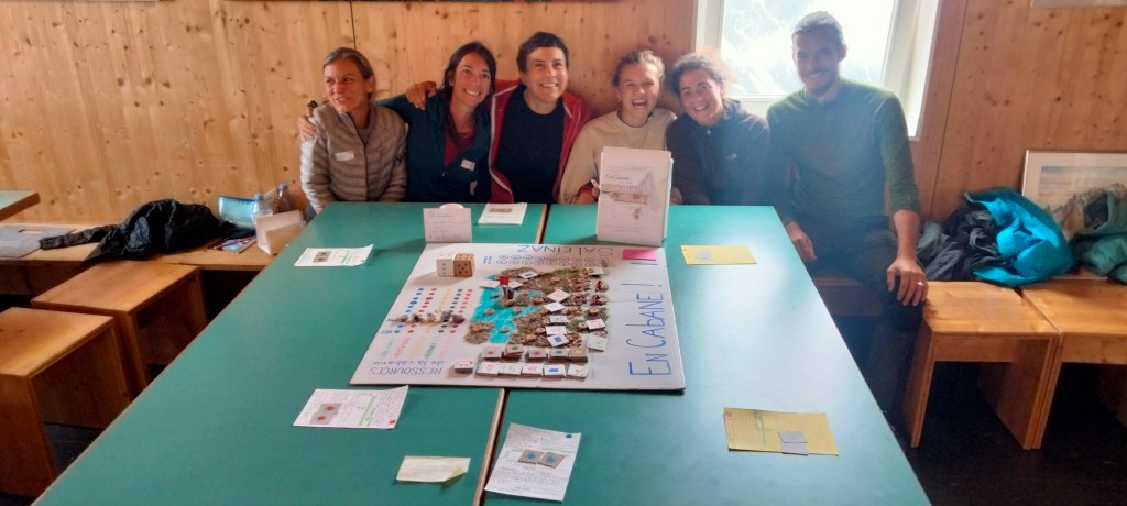 Nous avons donc eu l’idée de créé un jeu de plateau disponible au sein de la cabane et qui pourrait être diffusé dans d’autres cabanes. Le plateau de jeu s’inspire de la réalité du territoire autour du refuge en reprenant les noms des glaciers, villages, alpages environnant. Les règles sont inspirées du jeu Catane. Chaque joueur endosse le rôle d’un acteur local : investisseur, accompagnateur en montagne / scientifique, chasseur, berger, pratiquant d’un sport de montagne, exploitant. Pour gagner le jeu il va devoir répondre à des objectifs personnels mais surtout collectif en contribuant à la vie de la cabane à partir de ressources qu’il produit.